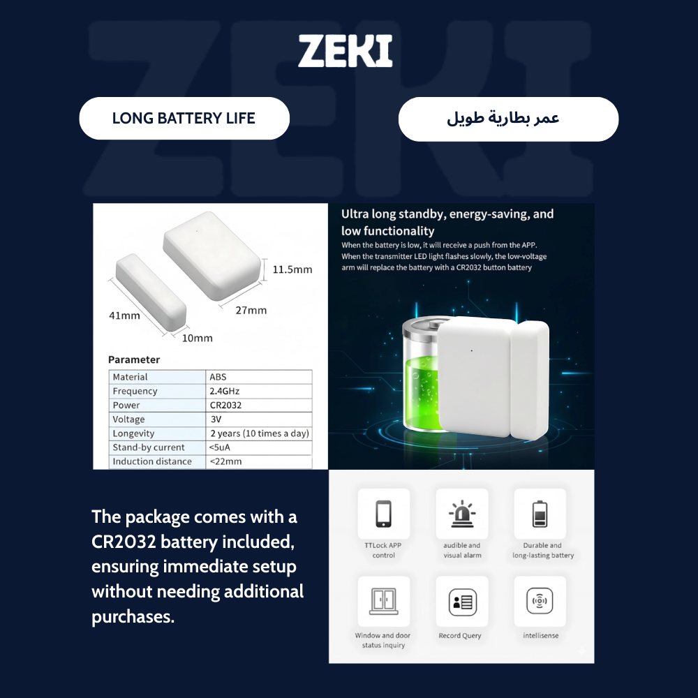 The ZEKI TTLOCK DOOR SENSOR DS2 installs in minutes using the included mounting components. Its compact door-mount design and <22mm detection range ensure a secure, dependable connection even with minor door movement. Powered by a long-lasting CR2032 battery, the DS2 is built for continuous performance.