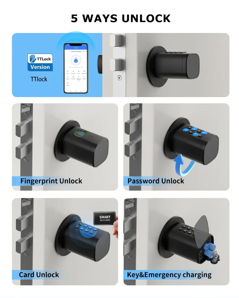 Leave your keys behind! The C1 Smart Lock Cylinder lets you unlock your door using fingerprint recognition, keypad entry, or a smartphone app—giving you complete flexibility whenever needed.