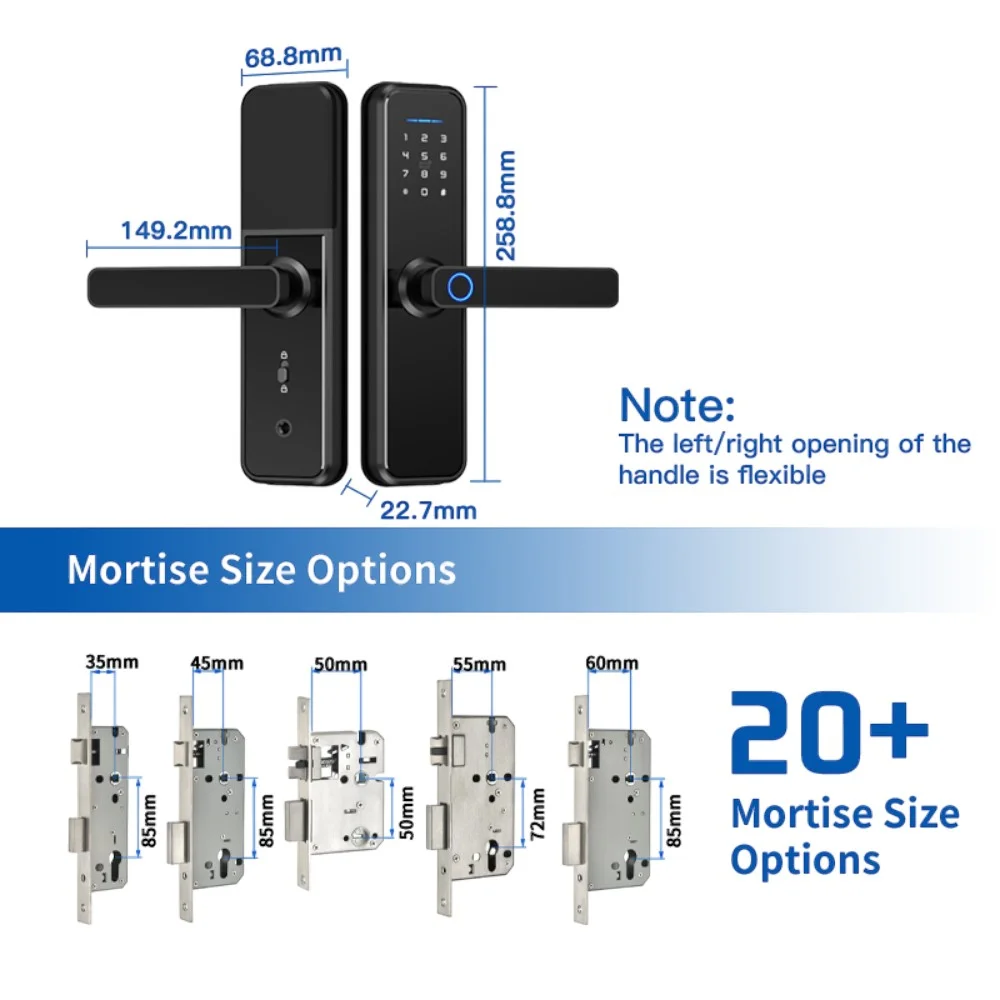Smart retrofit lock with 0.5s fingerprint access, backlit PIN keypad, and Tuya app control. Supports multiple unlock modes, auto-locking, tamper alarm, rechargeable battery, and easy DIY installation.